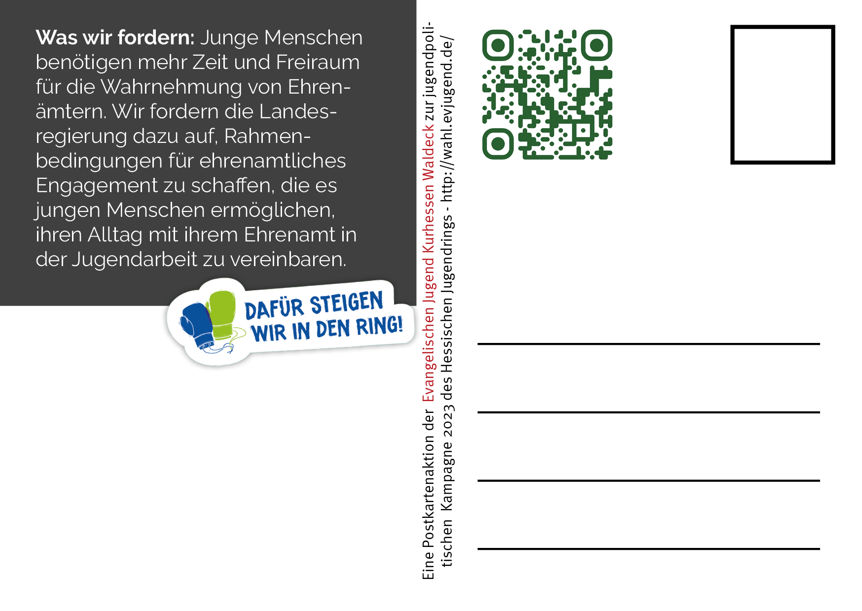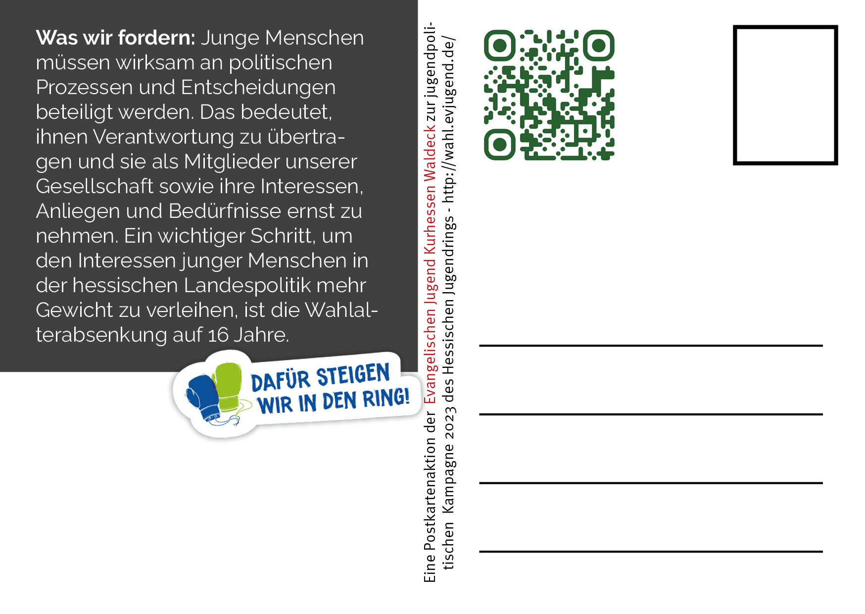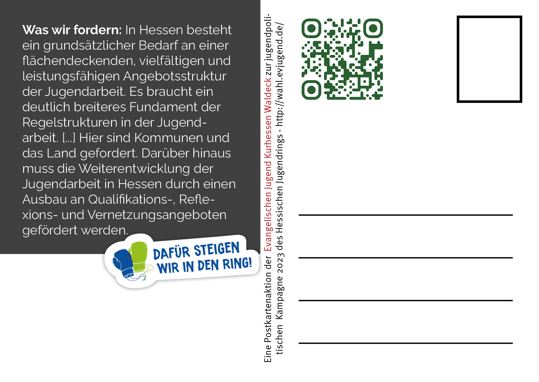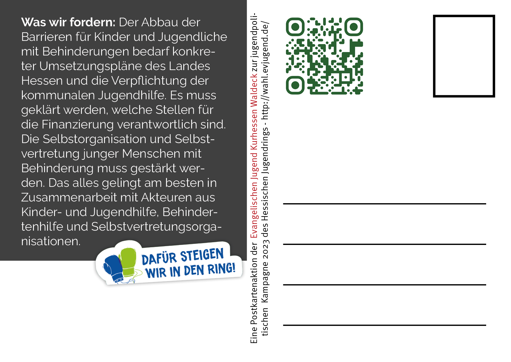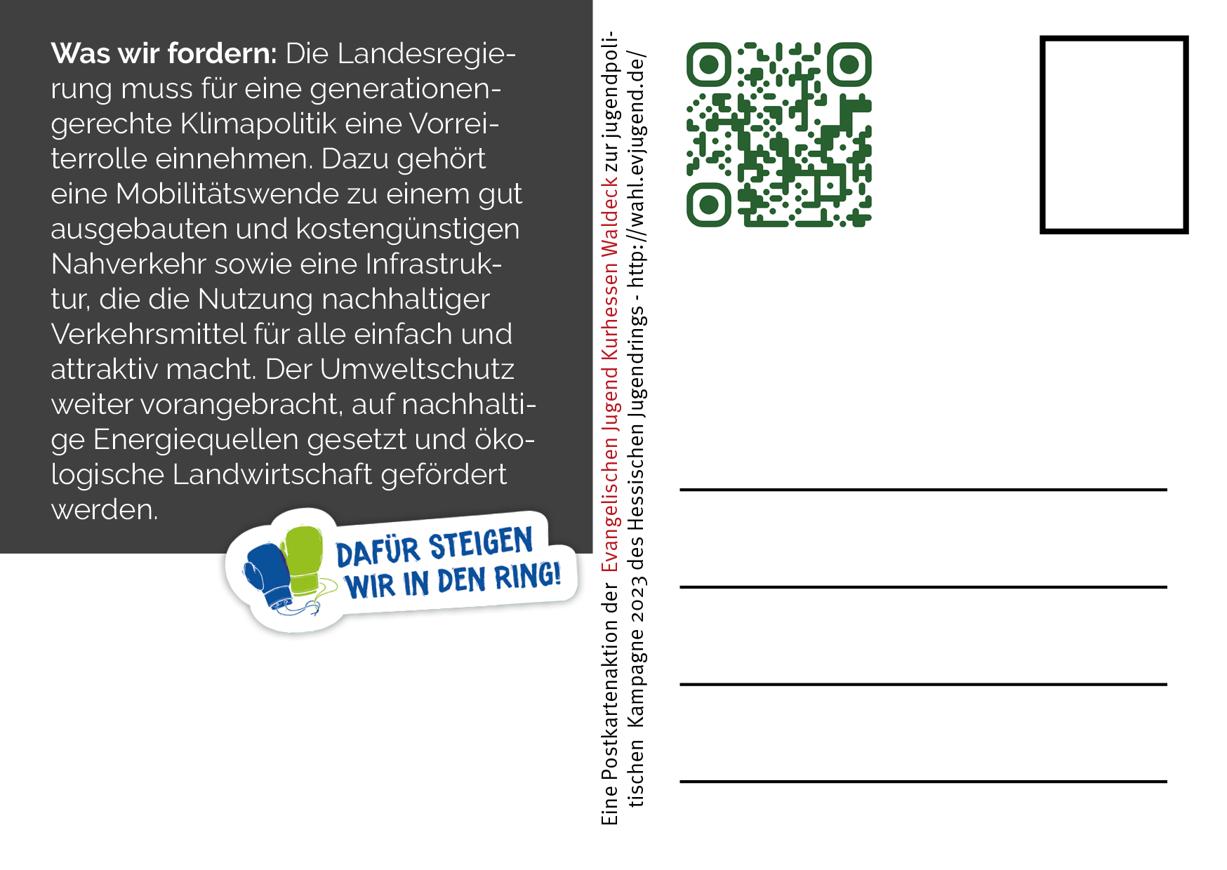 - oder Jugendliche gehen mit den Postkarten zu Ständen der Parteien während des Wahlkampfes und fragen nach deren Haltung zu den Forderungen